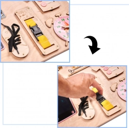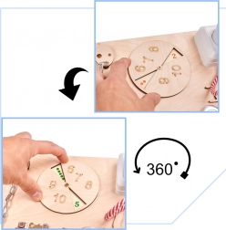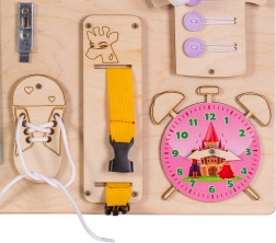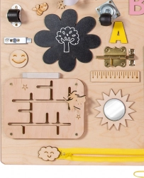 Sadrži raznoliku paletu aktivnosti: elektroničku magnetnu ploču s olovkom, obojene zupčanike, patentni zatvarač, biciklističko zvonce, različite vrste zasuna i kukica, cipelu za vezanje, košulju s gumbima, drvene brojeve i slova, kotačić s brojevima, labirint s pomičnim morskim psom, pločicu za kredu u obliku broda, mjernu ljestvicu, prekidač svjetla, utičnicu s utikačem, čičak traku, sigurno zrcalce u raketi, bravu s ključevima i remen s kopčom.