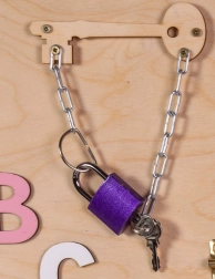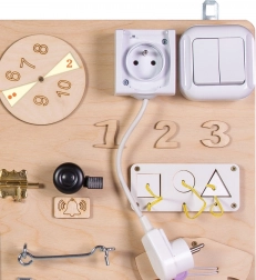 Prekidač svjetla, utičnica s utikačem, brave i zasuni uče djecu uzročno-posljedičnim vezama i praktičnim vještinama u sigurnom okruženju.