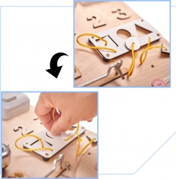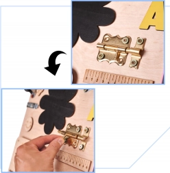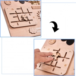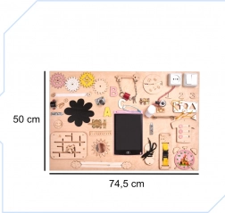 Ova velika drvena manipulatívna ploča osmišljena je kako bi djeci pružila sigurno okruženje za upoznavanje uobičajenih kućanskih predmeta. Glatko brušeno drvo i kvalitetna izrada jamče dug vijek i sigurnu igru. Ploču je moguće postaviti na pod, nasloniti na namještaj ili objesiti na zid zahvaljujući integriranim držačima.