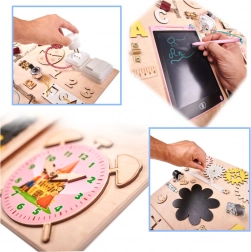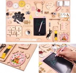 Magnetna ploča za pisanje, pločica za kredu, zupčanici i labirint razvijaju maštu, vizualnu percepciju i logičko razmišljanje.