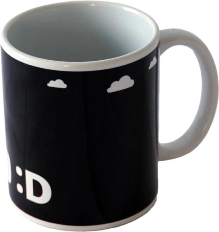 Termokromatski tisak otkriva razigrane motive Dječka nakon dolijevanja vrućeg napitka – kad se ohladi, šalica se ponovno oboji u crno.