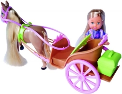 Set Evi Love u romantičnoj kočiji donosi djeci beskrajne mogućnosti priča – od vožnji kraljicom ili princezom do svakodnevne brige o konjiću. Evi udobno sjedi, drži uzde, a njen usklađen outfit naglašava čarobnu atmosferu igre.