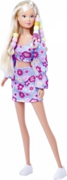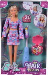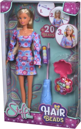 Lutka Steffi u cvjetnom dvodijelnom outfitu, s kukicom za navođenje perlica na pramen kose, šarenim perlicama, gumicom za fiksiranje i češljem s prostorom za pohranu. Visina lutke 29 cm.