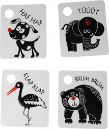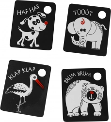 Kontrastne kartice s obojenim elementom osmišljene su za najmlađu djecu te pomažu usmjeriti pogled, vježbati fiksaciju i razlikovanje oblika. Zahvaljujući izraženom kontrastu i jednostavnim ilustracijama, privlače pažnju beba već od prvih tjedana života i potiču njihovu prirodnu znatiželju.