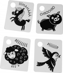Kontrastne crno-bijele kartice idealno su pomagalo za novorođenčad i dojenčad, čiji vid najbolje reagira na jednostavne oblike i visok kontrast. Zahvaljujući praktičnom otvoru i plastičnom prstenu, kartice se lako mogu objesiti iznad krevetića, na kolica ili spojiti u pregledan set.