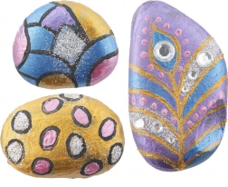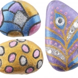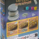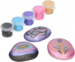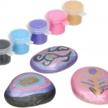 Set sadrži 3 prirodna kamena, kist, 5 posudica boja, ljepilo, šljokice i ukrasne kamenčiće – možete početi stvarati odmah.