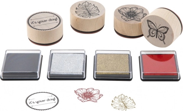 Set od 4 drvena žiga + jastučić – set sadrži 4 drvena žiga i tintni jastučić. Dvije vrste žigova – party i priroda.