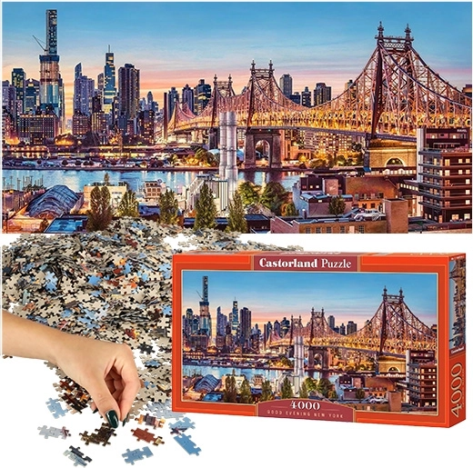 Uživajte u dugim satima opuštanja uz slagalicu od 4000 dijelova CASTORLAND s motivom GOOD EVENING NEW YORK. Nakon sastavljanja nastaje impresivna slika dimenzija 138 × 68 cm s detaljnim panoramskim prikazom New Yorka u sumrak. Kvalitetan karton i precizno rezanje osiguravaju točno spajanje dijelova i ugodno iskustvo slaganja.