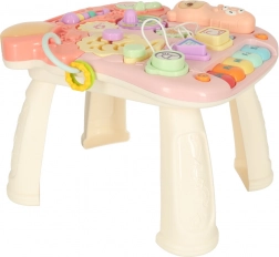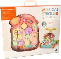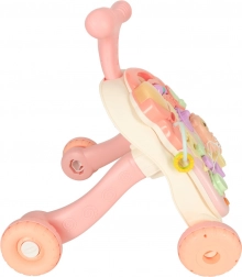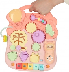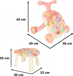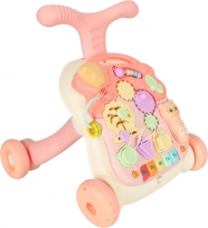 Ova multifunkcionalna igračka 3u1 prilagođava se razvoju djeteta: najprije služi kao viseća interaktivna ploča za mirnu igru, zatim kao stolić s aktivnostima za radoznalo stajanje, a na kraju kao hodalo za sigurne prve korake. Pastelna ružičasta boja i raznoliki elementi mame na istraživanje, tipke reproduciraju melodije i zvukove, a raznolike aktivnosti razvijaju djetetove vještine.
