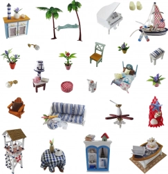 U pakiranju su minijaturni komadi namještaja i dekoracija – od viseće ležaljke i klavira do cvijeća i lampica. Sve za realističan i ugodan interijer.