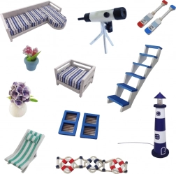 Minijatura kućice sadrži pomno osmišljene nautičke dodatke, poput kreveta u obliku broda i drugih fino izrađenih detalja. Svaki je komad koloristički usklađen kako bi istaknuo morsku temu i unio u vaš interijer osjećaj smirenosti i elegancije.