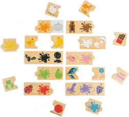 Zabavna drvena didaktička slagalica od Bigjigs Toys uči djecu prepoznavati boje pomoću 30 dijelova u 10 boja. Slažu se trojke (životinja, predmet, boja), vježba se koordinacija ruka-oko, logičko razmišljanje i proširuje rječnik. Prikladno za djecu od 2 godine.