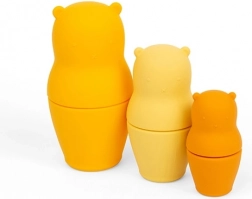 Set od tri medvjedića u tri veličine može se slagati jedan u drugog poput matrjoške, pa štedi prostor i istodobno razvija finu motoriku, koordinaciju ruka–oko i prepoznavanje boja. Mekani i sigurni materijal ugodan je na dodir i za usta, pa izvrsno služi kao grizalo tijekom nicanja zubića.