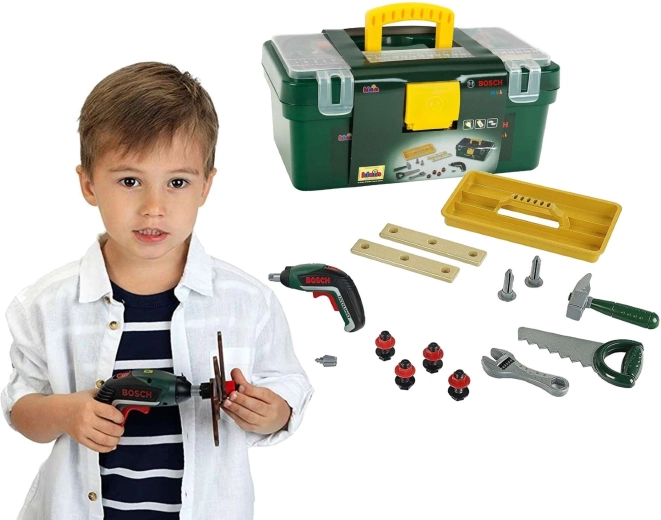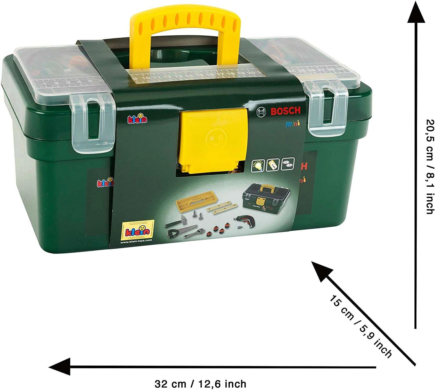 Dječji kovčeg s alatom marke KLEIN u licenciranom dizajnu BOSCH donosi sigurnu i zabavnu igru majstora. Praktični kovčeg u tamnozelenoj boji sa žutom ručkom i prozirnim poklopcem skriva bogat set alata uključujući bežičnu bušilicu IXOLINO II s okretanjem lijevo/desno, pilu, čekić, francuski ključ, vijke i građevne pločice. Sjajan izbor za razvoj motorike, kreativnosti i igre uloga djece od 3 godine.