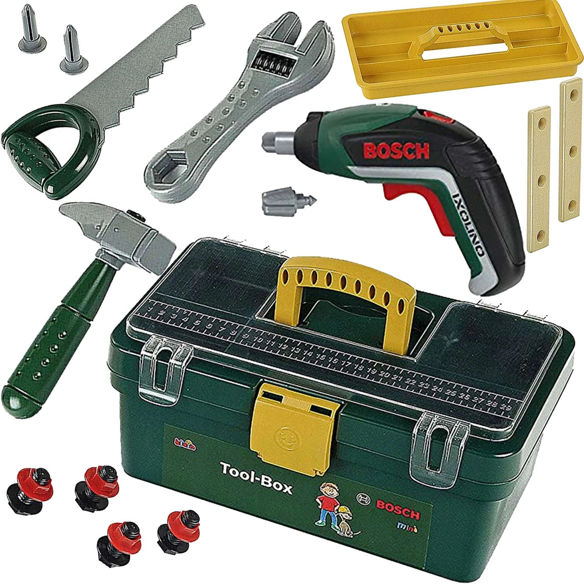 Kompaktni kovčeg s alatom u bojama BOSCH impresionira čvrstom konstrukcijom, udobnom žutom ručkom i otvarajućim prozirnim poklopcem, zahvaljujući kojem djeca odmah vide što je unutra. Dio seta je i izvadivi žuti pretinac s drškom za sitne dijelove kako se ništa ne bi izgubilo.