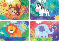 Dio seta su četiri pojedinačne puzzle s motivima životinja – majmun, zebra, lav i slon. Osim što djeca slažu cijele slike, mogu također vaditi i slagati pojedinačne životinje samostalno. Dimenzije dovršene puzzle su cca 24 x 16 cm.