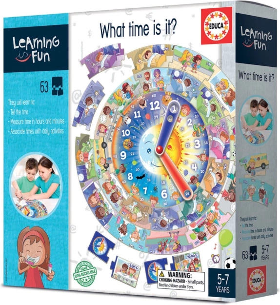 Educa Učenje je Zabavno pomaže djeci savladati svakodnevne vještine povezane s korištenjem satova i upoznaje ih s aktivnostima tijekom dana. Ova igra sadrži velike kružne puzzle s 39 dijelova i sat s kazaljkama, što omogućava integriranje logičkog razmišljanja i fine motorike.