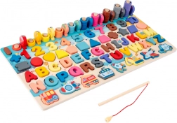 Drvena multifunkcionalna ploča nudi edukativnu igru koja kombinira zabavu i učenje. Cilj igre je naučiti djecu prepoznati brojeve, oblike i boje kroz interaktivne elemente.