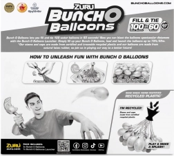 Vodeni baloni Bunch O Balloons koriste tehnologiju O-Ring i nude brzo punjenje. Dovoljno ih je spojiti na slavinu ili vrtnu cijev i za manje od 60 sekundi imate spremno 100 vodenih bombica! Možete ih bacati na prijatelje ili upotrijebiti aerodinamični lansirnik koji ih izbacuje do visine od 22 metra!