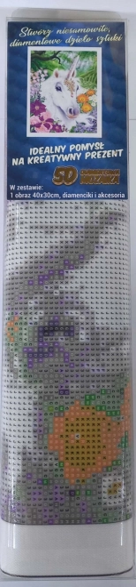 Dijamantno slikanje jedinstven je način opuštanja i stvaranja. S motivom jednoroga u cvijeću izradit ćete blistavu sliku koju nakon dovršetka možete uokviriti i izložiti. Postupak je jednostavan: pomoću olovke i voska lijepite obojene kameniće na označena mjesta na platnu.