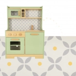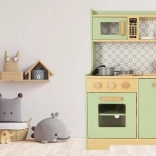 Dozvolite djeci da imitiraju roditelje u sigurnom okruženju s drvenom kuhinjom u mint boji. Sadrži sve nužne elemente kao što su pećnica, mikrovalna, pokretni štednjak i sudoper, koji proizvode realistične zvukove za što vjerodostojniju simulaciju kuhanja.