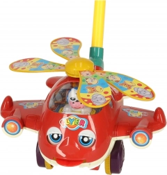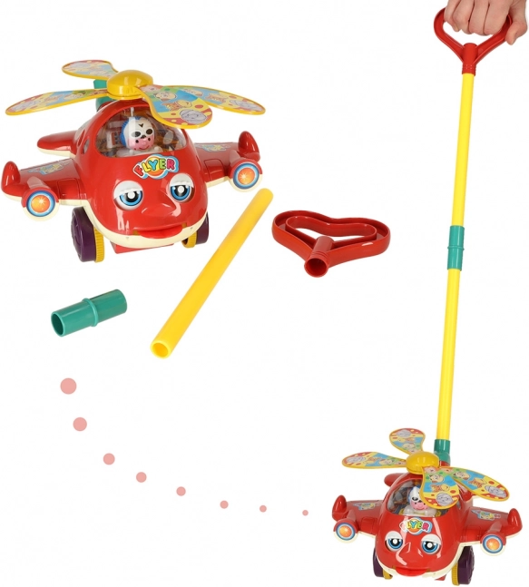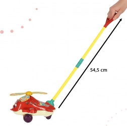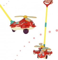 Dizajn igračake uključuje žive boje i vesele motive, što privlači dječju pozornost. Crveni helikopter pri kretanju vrti propelerima i ispušta zvuk zvonca. Potporna šipka je dizajnirana tako da odgovara visini djeteta i može se lako sklopiti za praktično skladištenje ili transport.