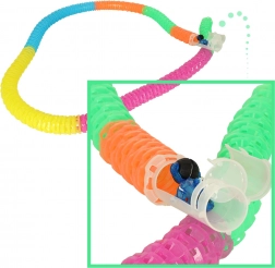 Kreativno povezivanje dijelova omogućuje slaganje staze u dva načina: slobodno za fleksibilne zavoje ili čvrsto za stabilne vertikalne konstrukcije. Autić, dodatno, zahvaljujući ugrađenom svjetlu pruža sjajan efekt u sumrak i jamči fantastičan doživljaj.