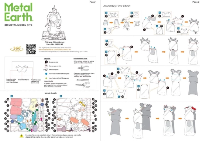 Pojedine dijelove izvadite iz metalnih pločica; po potrebi upotrijebite male kliješta-rezače (nisu uključeni). Dijelovi se međusobno spajaju pomoću zasuna koji se sastoje od jezička (kukice) i otvora. Jezičak savijte pomoću malih tankih kliješta (nisu uključena) te postupno spojite sve zasune dok ne nastane vrlo realističan majstorski primjerak!