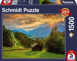 Uživajte u opuštanju i koncentraciji s kvalitetnim puzzleom SCHMIDT s motivom zalaska sunca nad planinskim selom Wamberg. Set od 1500 dijelova nudi prekrasnu sliku s bogatim bojama i oštrim detaljima, a nakon slaganja formira format cca 83,6 × 58,8 cm.