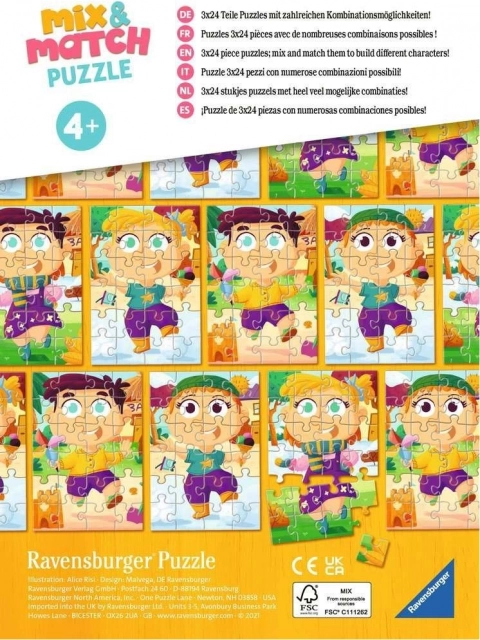 Otkrijte zabavno slaganje s edicijom Mix & Match, gdje mašti nema granica. U jednoj kutiji nalaze se tri kvalitetne puzzle s 24 dijela koje se mogu slagati standardno prema slikama ili proizvoljno miješati kako bi se stvorili novi, duhoviti likovi u šarenim haljinama.