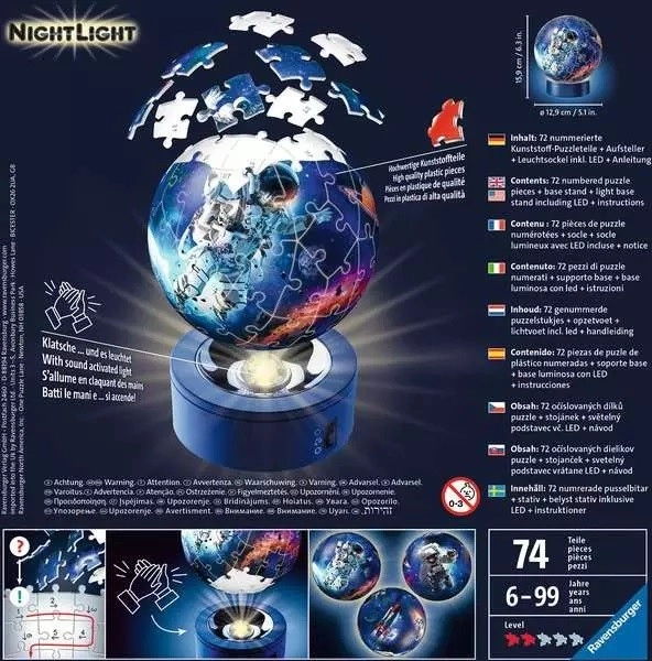 Zahvaljujući noćnoj ediciji Nachtlicht od Ravensburgera, i vaše dijete može imati očaravajuću svjetleću kuglu s svemirskim motivom. Slagalica je vrlo popularna ne samo zbog jednostavne manipulacije, već i stabilnosti. Za slaganje nije potrebno ljepilo; posebno izrađeni zakrivljeni dijelovi jednostavno se uklapaju i drže oblik. Slagati se može prema slici ili prema brojevima – plastični dijelovi su s stražnje strane numerirani. Promjer puzzleballa je 13 cm. Paket sadrži: