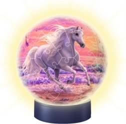 Otkrijte svjetleću 3D puzzleball s motivom konja na plaži od RAVENSBURGERA. 72 precizna plastična dijela slažu se bez ljepila u kuglu promjera 13 cm, koja zahvaljujući LED postolju prekrasno svijetli. Idealna zabava za djecu od 6 godina.