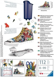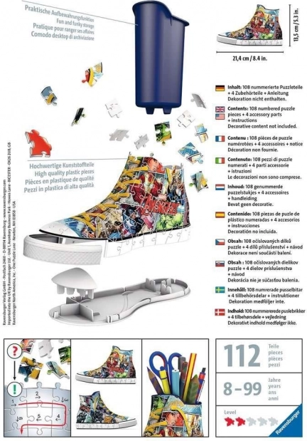 RAVENSBURGER donosi jedinstveno iskustvo s 3D tenisicama koje možete koristiti kao originalne držače za olovke za olovke, bojice ili kistove. Posebni zakrivljeni ili fleksibilni dijelovi, koji savršeno pristaju na svoje mjesto, omogućuju izradu dizajnerske tenisice s motivom Marvelovih junaka Avengers, koja izgleda vrlo realistično. Dijelovi su izrađeni od čvrste plastike i jamče izvrsnu stabilnost bez potrebe za lijepljenjem.