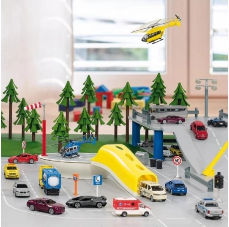Pametno oblikovana donja strana sadrži standardni SIKU WORLD konektor za lako povezivanje s ostalim dijelovima sustava. Prilazna cesta je dimenzionirana za vozila 1:50; kada je potrebna veća prolazna visina, moguće je skinuti krov ulaza i omogućiti prolaz većim modelima poput taksija ili hitne pomoći. U pakiranju ćete naći i helikopter HELI TAXI u mjerilu 1:87 za trenutnu igru.