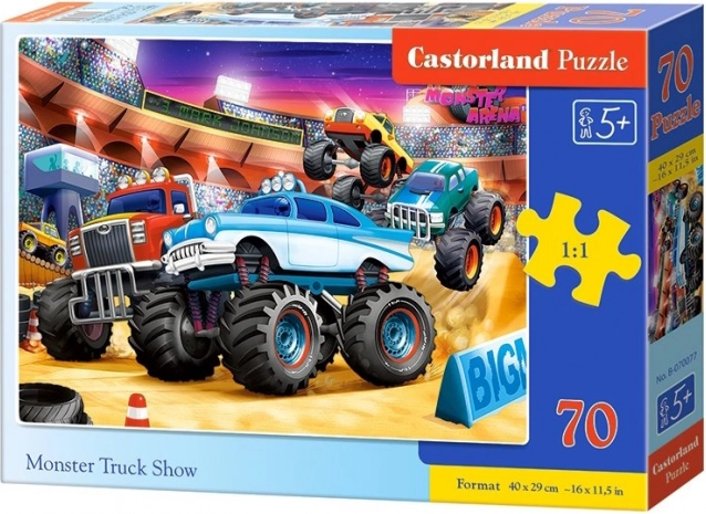 Šarene dječje puzzle Monster Truck Show sa 70 dijelova razveselit će male graditelje. Nakon slaganja nastaje slika 40 × 29 cm. Kvalitetna izrada i žive boje podupiru zabavu i učenje – slaganje razvija finu motoriku, koncentraciju i maštu.