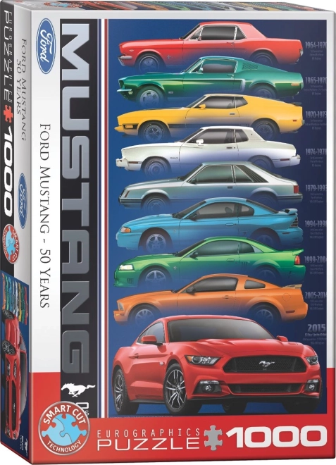 Proslavite legendu među automobilima uz puzzle EUROGRAPHICS povodom 50. obljetnice modela Ford Mustang. Čeka vas 1000 dijelova, jedinstvena nepravilna matrica rezanja za višu razinu težine i dimenzija nakon slaganja 48,89 × 67,63 cm. Tekstovi na slici su na engleskom jeziku.