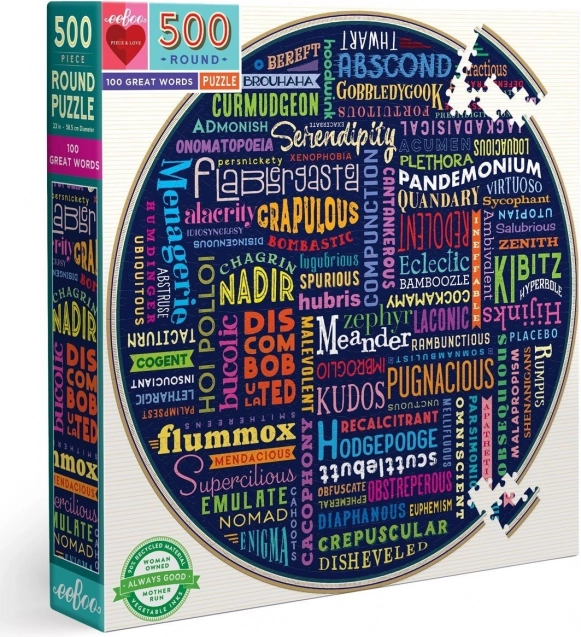 Otkrijte 100 riječi koje će vas ne samo zabaviti, već i educirati. Ova nekonvencionalna slagalica u okruglom obliku nas prenosi u svijet jezičnih igara koje će nakon sastavljanja postati prekrasna dekoracija u vašoj sobi.