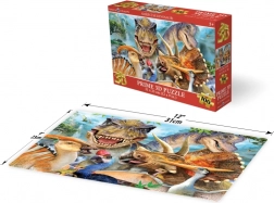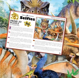Zabavna 3D slagalica s motivom dinosaurovih selfija oduševit će male i velike ljubitelje prapovijesti. Zahvaljujući 3D optičkom efektu slika djeluje plastično i prostorno, pa neki elementi izgledaju bliže, a drugi udaljenije. Slagalica sadrži 100 dijelova, a nakon sastavljanja ima dimenzije cca 31 × 23 cm.