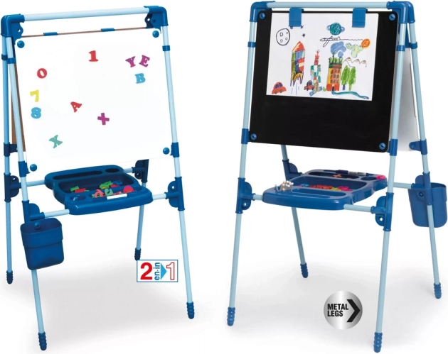 Stabilna konstrukcija s mogućnošću podešavanja visine raste s djetetom, dok sklopive noge olakšavaju prenošenje i spremanje. Odlagana polica prima sve potrepštine i istovremeno hvata prašinu od krede. U pakiranju se nalazi 64 magneta koji podupiru razvoj fine motorike, logike i predčitalačkih vještina.