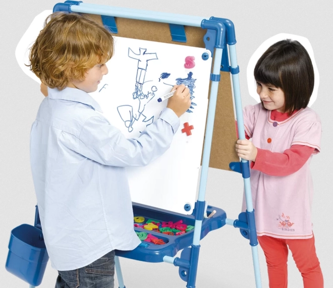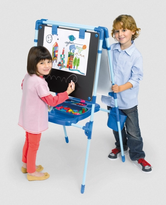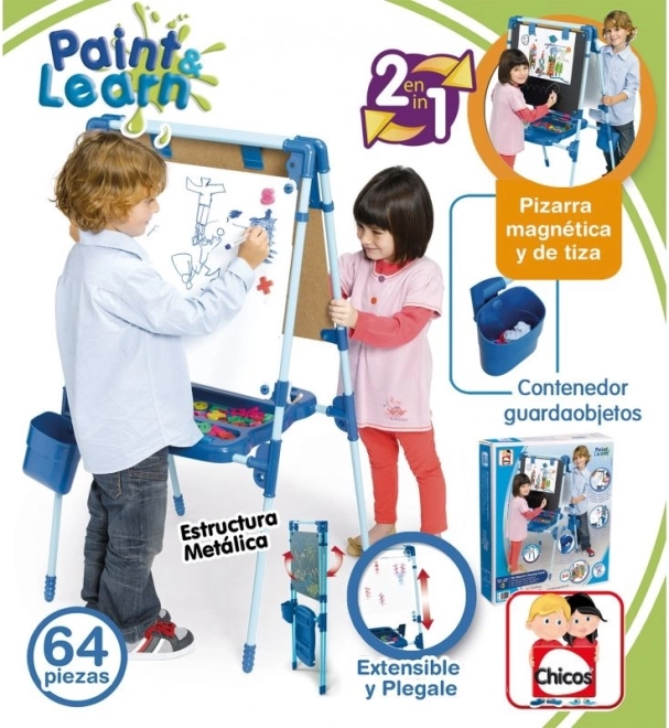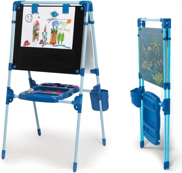 Obostrana dječja ploča 2u1 CHICOS potiče crtanje i učenje. Jedna strana je bijela magnetska za flomastere, druga crna kredna za klasičnu kredu. Nudi podesivu visinu, sklopivu konstrukciju za jednostavno spremanje, kvačice za papir i praktičnu odlaganu policu. U kompletu je 64 magneta za razigrano učenje slova i brojeva.