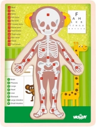 Ova kvalitetna drvena slagalica razvija dječju maštu, finu motoriku i logičko razmišljanje. Dijete slaže dvanaest dijelova s prikazom djevojčice, a na njihovoj stražnjoj strani nalazi označene ljudske organe. Podložna slika prikazuje ljudski kostur i sadrži numerirani popis organa i kostiju – odlična osnova za prvo upoznavanje s anatomijom na engleskom.