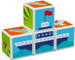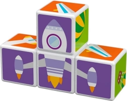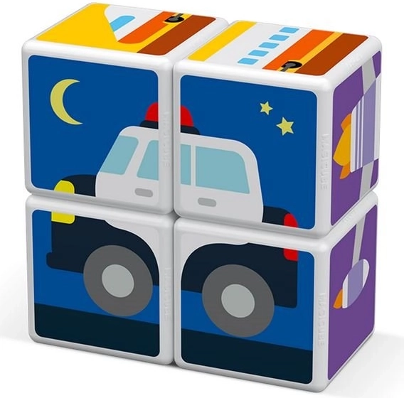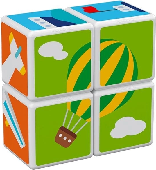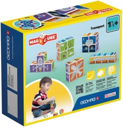 GEOMAG Magicube Printed Transport je pametna magnetska građevna igra koja spaja igru i učenje. Četiri otisnute kocke s motivima prometa i tri obostrane karte pozivaju djecu na slaganje automobila, zrakoplova, raketa i drugih slika. Zahvaljujući magnetima koji djeluju na svakoj bridnoj strani, građenje je intuitivno i sigurno.
