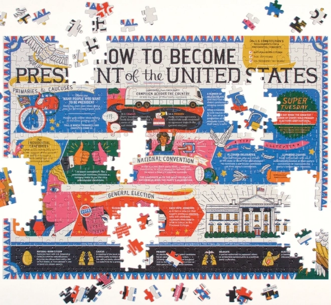 Ova dvostrana slagalica brenda GALISON nudi dvostruku dozu zabave. S jedne je strane površina sjajna, s druge mat, što olakšava razlikovanje motiva i povećava udobnost slaganja. Tema vas vodi kroz prekretnice predsjedničkih izbora u SAD-u – od predizbora preko nominacija do završnih izbora.