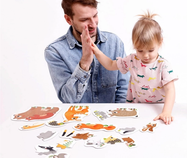 Igra s puzzlama pomaže djeci proširivati rječnik (imenovanje životinja, boja i dijelova tijela), trenira koordinaciju oko–ruka i potiče koncentraciju. Roditelji mogu uključiti jednostavne igre i pitanja, oponašati zvukove životinja ili zajedno tražiti informacije o životu u šumi.