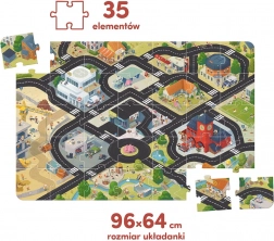 Otkrijte užurbani gradić i njegove stanovnike s velikim podnim puzzlama. Pripremite igraće autiće i krenite na ceste! Isplanirajte vlastitu rutu i posjetite omiljena mjesta. Ilustracije pune humora i detalja potiču kreativnu igru. Pozovite braću i sestre te prijatelje i uživajte u zajedničkim trenucima!