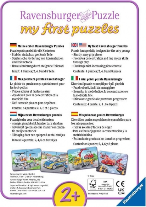 Otkrijte prvo slaganje s Ravensburger puzzle setom za najmlađe. Četiri slike interventnih vozila s progresivnim brojem dijelova 2, 4, 6 i 8 razvijaju finu motoriku, koncentraciju i maštu. Ekstra čvrst karton i robustni dijelovi olakšavaju rukovanje i odolijevaju dječjim ručicama. Idealno od 2 godine.