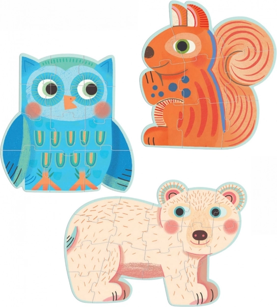 Set DJECO U šumi 3u1 donosi tri preslatke slagalice u obliku šumskih životinja. Zahvaljujući različitim razinama težine, djeca na razigran način poboljšavaju koncentraciju i uvježbavaju opažanje. Šarene ilustracije potiču igru i razvoj mašte.