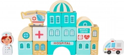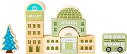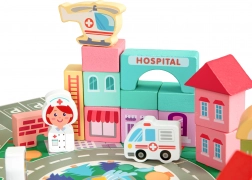 Detaljno otisnuti drveni blokovi donose ključne gradske zgrade i vozila – od hitne pomoći do policijskog auta – za realističnu igru i učenje uloga u gradu.