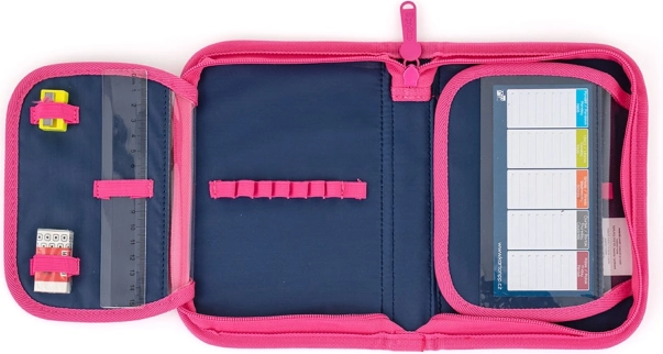 Pernica je jednoslojna, ima gumene držače za olovke i pribor te prozirnu foliju za raspored sati, što olakšava organizaciju školskih potrepština.