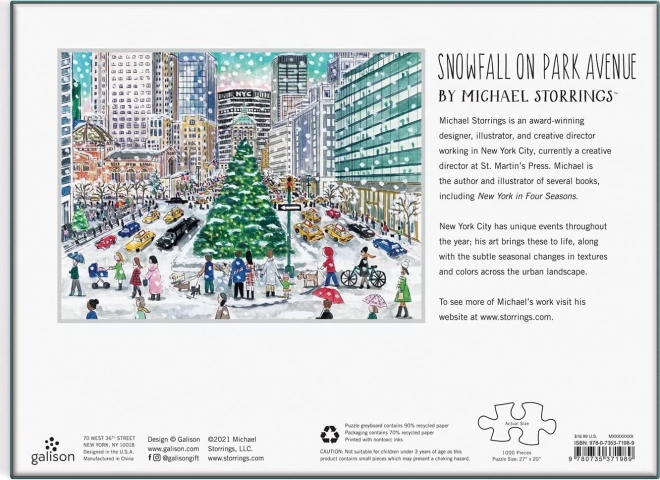 Uživajte u čarobnoj atmosferi zimskog New Yorka uz puzzle Snježženje na Park Avenue autora Michaela Storringsa, s ukupno 1000 dijelova. Idealna zabava za duge zimske večeri koja ne samo da razvija vašu logiku, već donosi i radost održivo proizvedenog proizvoda.